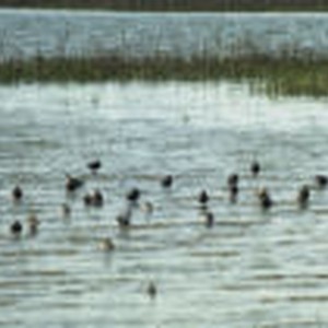 Dowitchers staning in shallow water.