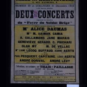 Salle des agriculteurs...Samedi, 30, et dimanche, 31 decembre 1916, a 20 heures precises, deux concerts organises au benefice du "Foyer du soldat belge"
