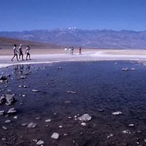Slide shows people walking on the salt flats around a pool at Badwater Basin. Badwater Basin is the lowest point in North America at 282 feet below sea level. Scanned with Epson Perfection V700 Photo as 3200 dpi TIFF image in 24 bit RGB color.