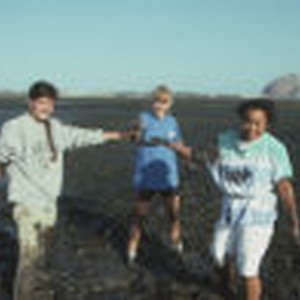 Three students proudly display a clam that they dug up from the mud.