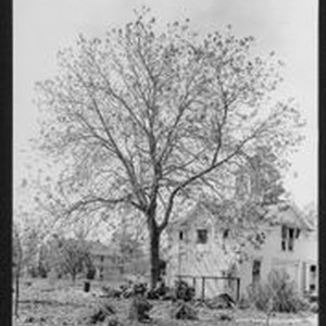 Photo, black and white: "Paradox" Burbank black walnut, Santa Rosa--typewritten info on back, April 10, 1930. Stark Bros, Nursery, Louisiana, MO. The walnut tree is seen in the side yard of a two story clapboard house with another house in the distance