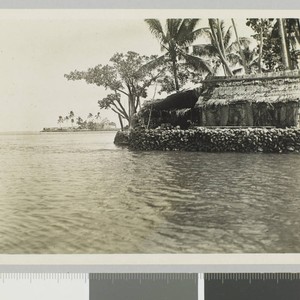 Thatched roof houses built on small manmade islands reinforced with rocks and coral. Title transcribed from envelope. Date devised by cataloger. . Verso of photograph reads: "Two of the wonderful 'villages' - native 'Venices' of Solomons proper. I, Charmian London was just about to go 'aboard' one of them (tho they are not floating islands) where I was stricken with Solomon Islands feber. We were in a dangerous cannibal place & everybody bristling. Read my Log of the Snark."
