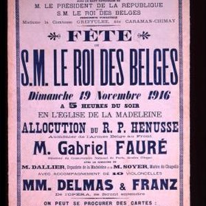 Fete de S.M. le Roi des Belges, dimanche 19 novembre 1916 ... Mr. Gabriel Faure, directeur du Conservatoire national de Paris, tiendra l'orgue