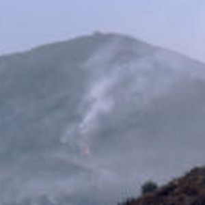 Distant view of fire in San Antonio Canyon with a bulldozer and men at the top of the mountain.