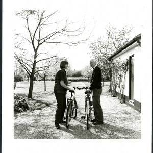 Gray photo of Charles and Elizabeth Handy biking, taken by Elizabeth Handy. Charles and Elizabeth are facing each other outdoors. Charles is smiling directly into the camera lens.