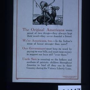 The original Americans were proud of two things: they always kept their word - they never deserted a friend. We're Americans too - is the Indian's sense of honor stronger than ours? Our government must keep its word by paying its war bills ... Uncle Sam is counting on the fathers and mothers of patriotic children thoughout America to lend all they can to their country during the Victory Liberty Loan