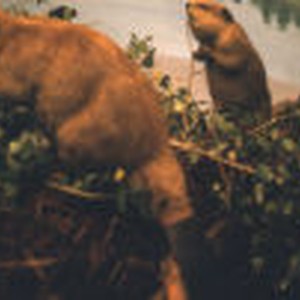Museum diorama showing two American beavers at the Los Angeles County Museum of Natural History.