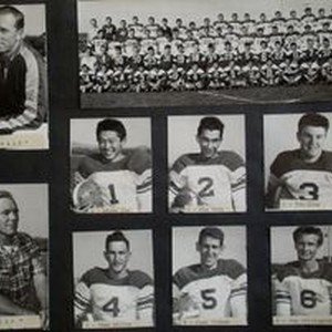 Photo--Black and white: Analy High School Tigers football team of fall 1950. Top right group picture of full squad with coaches and managers. Individual pictures on left top: Walt Foster, coach and bottom Leo Whalon, coach. Six individual photos: Ito, Steve (1) Pete, Jim (2) King, Tom (3) Dilley, Russ (4) Totman, Jack (5) Tillinghast, Jim (6).