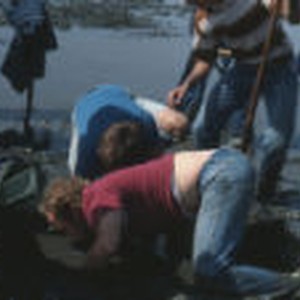 Jon Leiser, Deirdre Kuhl, and Denny Watumull dig in the mud.