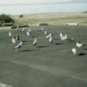 A flock of ring-billed gulls running through a parking lot.