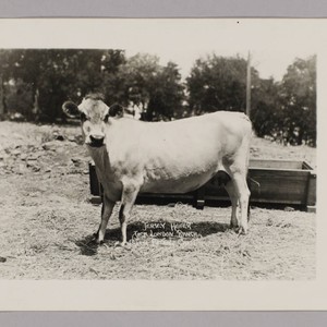 Full view of a cow from the side standing in front of a trough. Title transcribed from print on photo, reading: "Jersey Heifer. Jack London Ranch. Glen Ellen Calif." Also printed in lower left corner: "1014. P. A. Payne Foto." 2 copies.