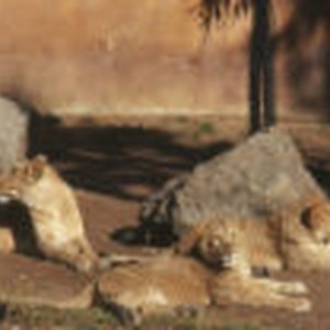 A female lion and her two yearlings are lying in the sun next to boulders.