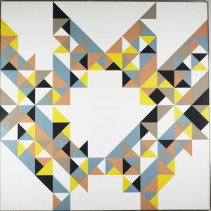 Non-objective painting of a multi-colored geometric design.
