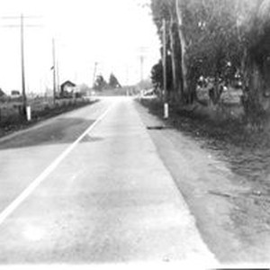 Photo--black and white: Highway 116 at Bloomfield Road to the right with vintage car at intersection. The P&SR railroad tracks can be seen on left side near the small building that is the Bloomfield Station.