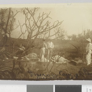 Jack and Charmian London and unidentified man at lava grave site on Savai'i Island. Title transcribed from envelope. Date taken from biographical sources. Handwriting on bottom front of photo reads: "Gravesite lava eruption on Savaii." Verso of photo is marked with layout notes.