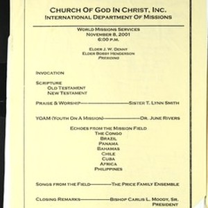 World missions services program, 94th Annual Holy Convocation of the Church of God in Christ, Memphis, Tennessee, 2001 November 8. Includes a page of handwritten notes. [Description English/roman)]