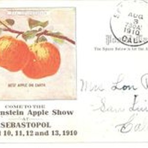 Postcard photo, color: Gravenstein Apple Show advertisement postcard for the 1910 show. Postmarked from Sebastopol August 3, 1910 to Mrs. Lon (Clara) Brooks of San Luis Obispo, CA. Message on verso.