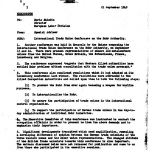 David J. Saposs memo regarding the International Trade Union Conference on the Ruhr Authority, with attachments