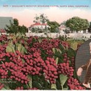 Postcard--photo hand colored: Field of fruiting Burbank spineless cactus with wooden fence and barn and houses beyond. Oval picture of Burbank in lower right corner. Caption: "2432--Burbank's Fruitful Spineless Cactus, Santa Rosa, California." Handwritten bottom left "Copyright 1908 by Turrill & Miller." Edward H. Mitchell postcard No. 2433.