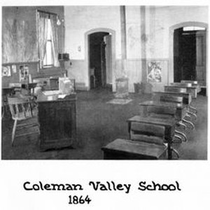 Photo--black and white: Interior of Coleman Valley School, built in 1864 and located on Coleman Valley Road in Occidental. Picture from "Wooden School Houses of Sonoma County" booklet by Mike Carey and his Yulupa School Third Graders, 1975.