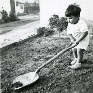 Toddler Tom Martinez plays with a big shovel in the dirt of the family's front yard, City Terrace.