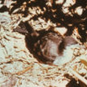 A shearwater sitting on top of leaves and branches.