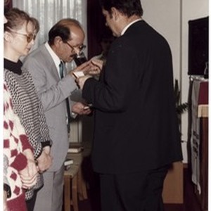 Photograph of Mihael Kuzmič giving Lord's Supper to the newly baptized older man. [Description English/roman)]
