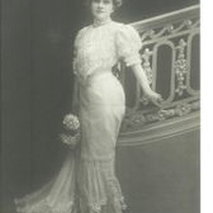 Postcards--black and white: woman in Victorian fashion with flowers in her hand and standing against staircase railing. Photo titled "Christie McDonald" and "Rotograph" series. The Rotograph Co. N.Y. City"