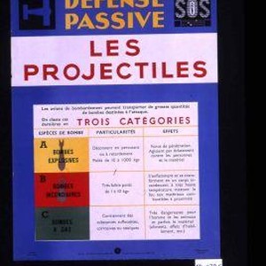 Defense passive. Les projectiles. Les avions de bombardement peuvent transporter de grosses quantites de bombes destinees a l'attaque. On classe ces dernieres en trois categories. Especes de bombe: A. Bombes explosives; B. Bombes incendiaires; C. Bombes a gaz. Particularites: [description of each type] ... Effets: [description of effects of each type]