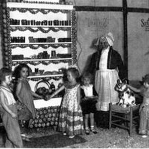 Mary Evelyn Cruse(left) (b 1927), niece of Hubert B. Scudder, at the Gravenstein Apple Show circa1932. Mary and four other kids are standing at the "Old Mother Hubbard" exhibit.