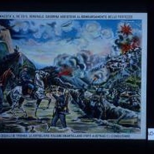Sua maesta il re ed il Generale Cadorna assistono al bombardamento delle Fortezze. Con squilli de tromba le Artiglierie Italiane smantellano i forti Aurtriaci e li conquistano