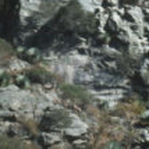 Two rams, one lamb, and one ewe grooming herself while standing on a cliff in The Narrows located in East Forks.