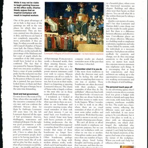 Article by Charles Handy on how a boring environment breeds boring employees, and how individual quality and style benefit workers by making their lives and efforts more meaningful and productive. Handy begins the article commenting on how the great advantage of art in Italy is that most of the paintings are still in the places for which they were commissioned--they are frescoes. Handy then reflects on what equivalents there now are to such artistic spaces and boardrooms and executive meeting rooms, arguing that, although we cannot all devise or afford stylish murals in corporate spaces, people can introduce values and expression in one way or another. Despite the cost associated with infusing sterile corporate spaces with more values and vibrancy, Handy suggests that the benefits outweigh the costs because efficient spaces rarely produce creativity and change, nor do they encourage sensitivity to the world they serve. Handy closes the article praising the fact that corporations are, at long last, waking up to the opportunities to create imaginative work environments.