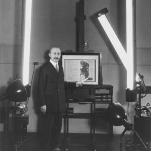 Dr Lodewyk Bendikson stands before an easle supporting the Franklin Autobiography; he is pointing to the ink stain while looking directly at the camera. Dr. Bendikson is wearing a dark three-piece suit. Tall lights illuminate the scene. Title supplied by cataloger.