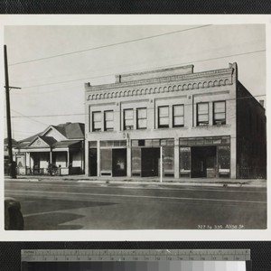 View of a residence next to a brick building with vacant storefronts on Aliso Street near Old Chinatown, Los Angeles. Title transcribed from photograph.