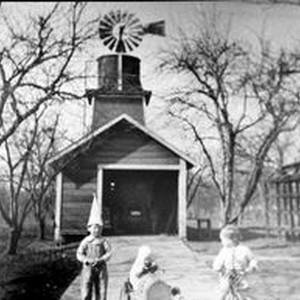 Photo--black and white, from Borba 8" x 10" celluloid negative: Three unidentified children playing in the driveway of a garage. One child rides a tricycle, a younger child sits in a play auto and an older boy stands wearing a paper hat. The garage to the rear stands amid an apple orchard and a windmill is behind the garage. Circa 1930s