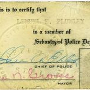 Photo--color: Sebastopol Police Officer Lemual "Shorty" Plumley's ID card signed by Chief of Police John Ellis and Mayor George N. Groves with Plumley's fingerprint.