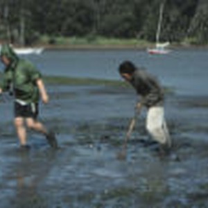 Students dig with hands and shovels with sailboats in background.