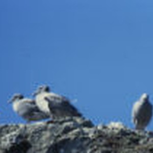 Adult and young Western gullls standing on some rocks.