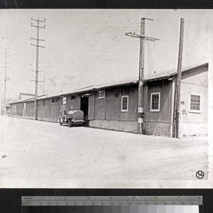 View of an industrial building on Date Street and College Street near Old Chinatown in Los Angeles, with a Seaboard Motor Oil truck parked at door. Title transcribed from photograph; title on item very faded.