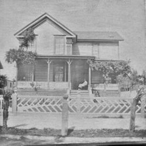 Photo--black and white: The Otis and Harriet Allen home at 1033 4th Street in Santa Rosa. Mary is on the front porch.