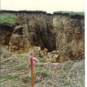 Photo--color: View of the damage caused by a landslide in western Sonoma County April 1983 in the Blucher Valley area of Sebastopol. Heavy daily rains from mid-January to April saturated the ground. The land--a field above Blucher Valley Road--split at the crest of a steep, hilly field owned by the Bolt family. The 'crack' is still there today--2009. Landslide details provided by Frank Baumgardner.
