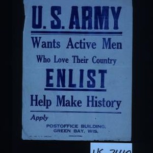 U.S. Army wants active men who love their country. Enlist, help make history. Apply: Postoffice Building, Green Bay, Wis