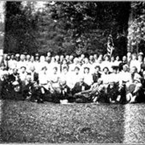 The dress parade of GAR (Grand Army of the Republic was a fraternal organization composed of veterans of the Union Army who served in the American Civil War) and Ladies Axilliary, standing in front of a mammoth pine tree at Camp Meeker California near the Russian River.