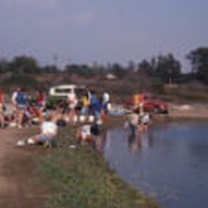 Scene of the Bernard Field Station lake shoreline with people and automobiles.
