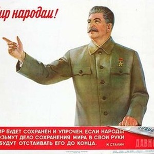 Soviet poster. Caption on top reads, "Мир народам! / Mir narodam!", meaning, "Peace to all nations!". Caption on the bottom contains a quote from one of Joseph Stalin's speeches dedicated to the world peace, "Мир будет сохранен и упрочен, если народы возьмут дело сохранения мира в свои руки и будут отстаивать его до конца". [Description English/roman)]