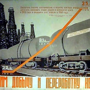Soviet industrial poster. Caption reads, "Увеличим добычу и переработку нефти! / Uvelichim dobychu i pererabotku nefti!", meaning, "Let's incerase the oil production!". [Description English/roman)]