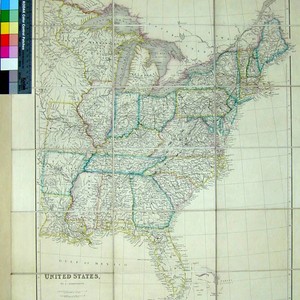 Kashnor notes, "The most westerly states are Missouri, Arkansas and Louisiana. Wisconsin is called North-West Territory, or Huron. and the map takes in the Minnesota country beyond Red River, locating Pembina." Prime meridian: London. Relief: hachures. Graphic Scale: Miles. Projection: Pseudocylindrical. Printing Process: Copper engraving. Verso Text: MS note: 602 Two of eighteen segments have green cloth backing..
