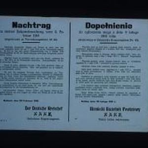 Nachtrag zu meiner Bekanntmachung vom 9. Februar 1916 ... Samtliches Brotgetreide (Roggen und Weizen) ist sofort nach dem Drusch, spatestens jedoch bis zum 1. April 1916, an die Wareneinfuhr abzuliefern. ... Kalisch, den 28. Februar 1916. Der deutsche Kreischef Hahn, Geheimer Regierungsrat. ... Niemiecki Naczelnik Powiatowy Hahn, Tajny radca rejencyjny