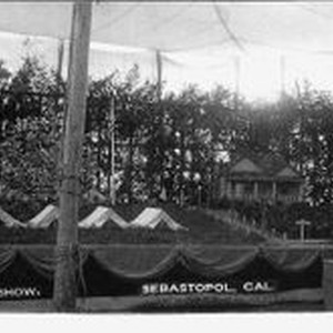 Postcard--photo--black and white: Sebastopol's Gravenstein Apple Show display of diorama with tents. Street sign "Barlow." Barlow's Berry pickers were boys and girls from the Children's Aid Society of San Francisco who worked picking berries at the Barlow Ranch. They lived in a tent "town" on the Barlow property, attended Sunday School locally and swan in the creek for recreation. The children shared in the proceeds from the sale of the berries.
